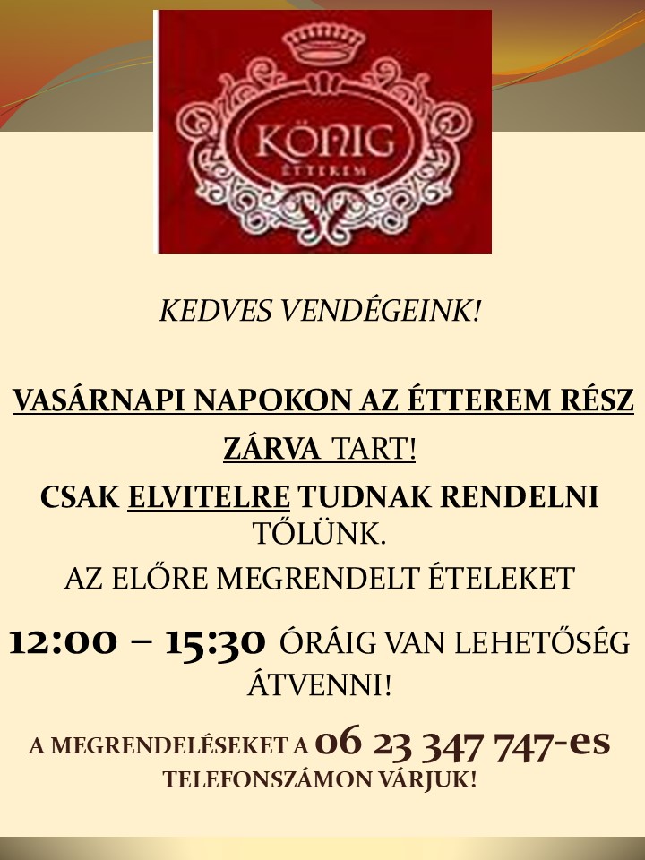 VASÁRNAPI NAPOKON AZ ÉTTEREM RÉSZ ZÁRVA TART! EZEN A NAPOKON CSAK ELVITELRE TUDNAK RENDELNI TŐLÜNK. KEDVEZVE AZON VENDÉGEINKNEK, AKIK KÉNYELMESEN OTTHONUKBAN SZERETNÉK ELFOGYASZTANI AZ ELŐRE MEGRENDELT ÉTELEKET, MELYEKET 12 – 15:30 ÓRÁIG TUDNAK ÁTVENNI!