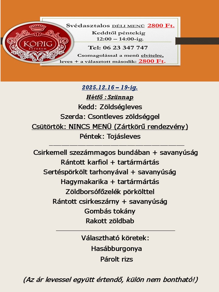 Ha inkább kényelmesen, otthon fogyasztaná el fogásainkat, ELVITELRE is kérheti kiválasztott ételeinket. Kérjük, hogy megnövekedett rendelések miatt, a szombati és vasárnapi elviteles ételeket az adott héten, lehetőleg péntekig rendeljék meg!